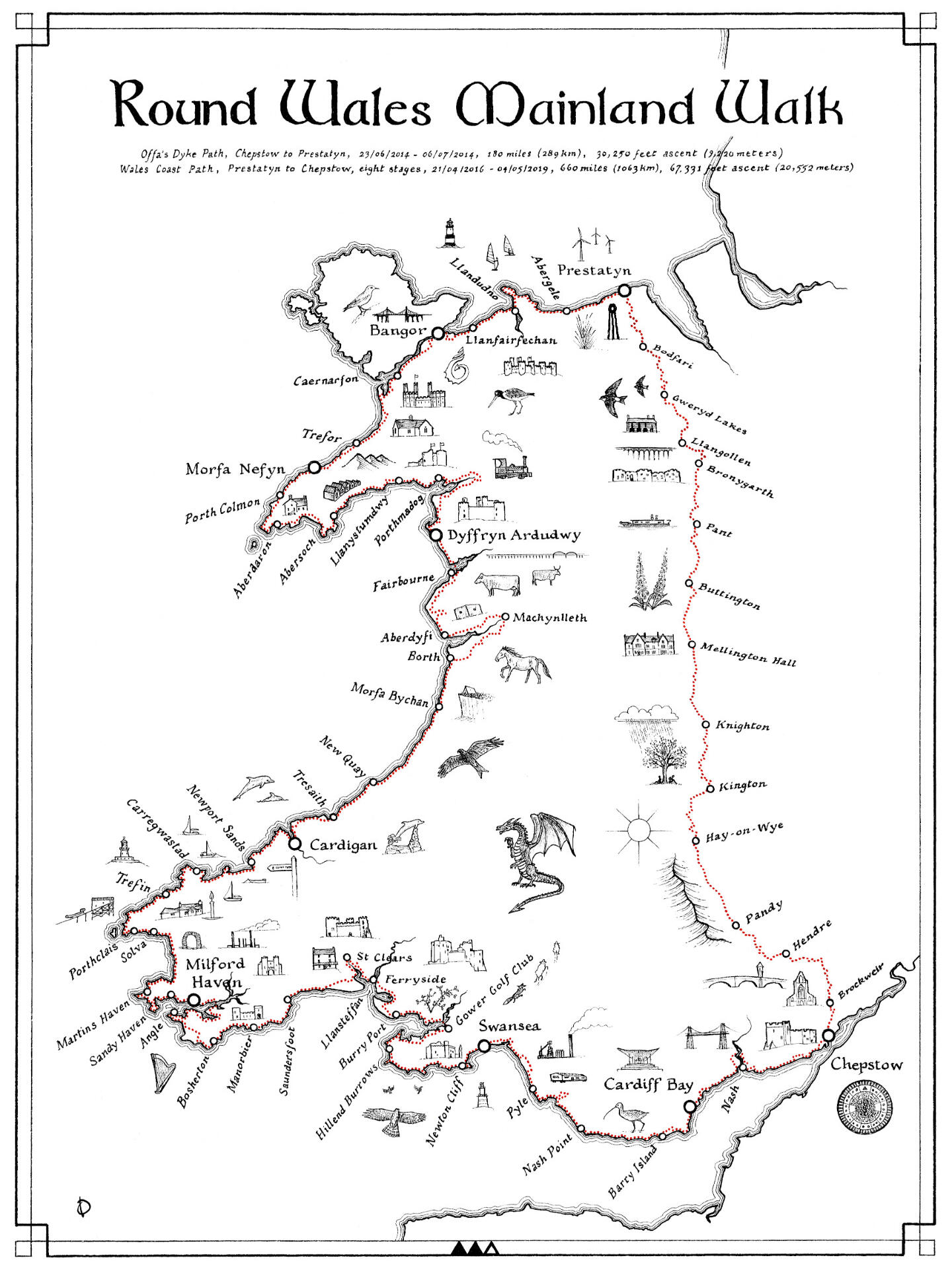 ROUND WALES MAINLAND WALKThis piece was completed in 2020 to commemorate an amazing achievement of circumnavigating the country of Wales, starting with 180 miles on the Offa's Dyke Path from Chepstow in the South to Prestatyn in the North, then the 660 miles of Coastal Path back around to Chepstow. Liz walked this route in stages over a few years, and I loved having the opportunity to illustrate these amazing memories.Here's what Liz had to say:"My husband commissioned a map for my birthday (way back in the summer, but COVID-19 delayed the framing so it will be January 2021 before it’s hanging on the wall). The map commemorates my walk round the perimeter of the Welsh border and coast, walked over a period of three or four years, partly with my daughter, partly with a friend, occasionally with road support from my husband, but mostly backpacking solo.It’s an incredible route as it’s so varied. Offa’s Dyke along the Welsh/English border is hilly, rural and relatively remote, whereas the coast can be very urban, with seaside towns, caravan parks, shipping ports and heavy industry, yet also wild and rugged and remote.I recorded my journey in a sketchbook and a handwritten journal so Owen’s hand drawn map was the perfect personalised souvenir. Watching his videos unfold online was a joy. Not many people have the chance to walk round the edge of a whole country (Anglesey excluded) and I now have a reminder that will last as long as the memories."- Liz Wakelin