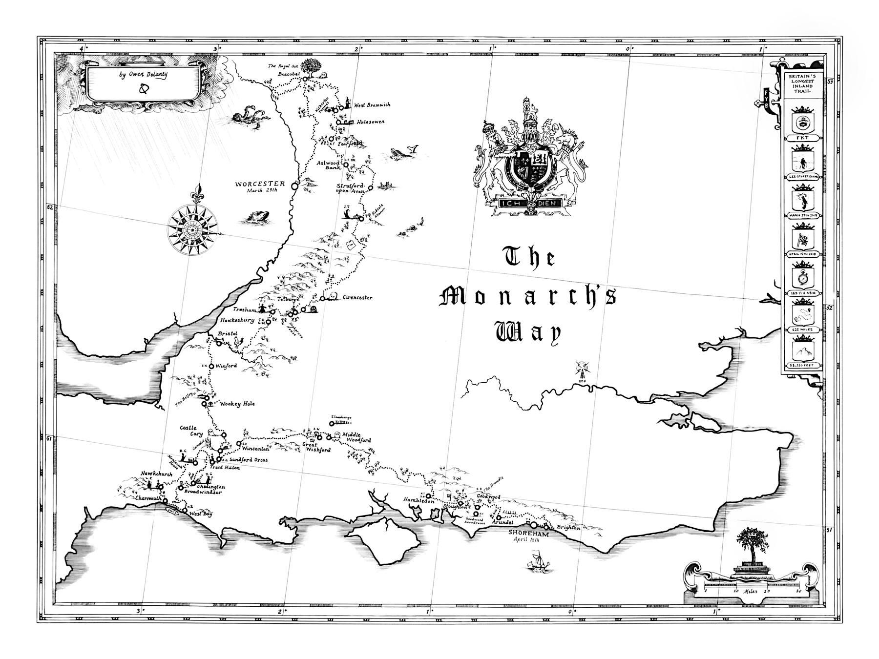 THE MONARCH'S WAY FKTOne of my favourite commissioned maps, both in terms of the process of creating it, and the end result. I spoke with Lee-stuart before I started, to get some insight into his adventure, and it left me in stitches. So many amusing stories and events along the journey, that made creating this map an absolute joy."I commissioned Owen to create a very personal map of my Fastest Known Time on the Monarch’s Way in 2018. There is a certain magic that is required to do something as wonderful as his maps and the time he spent speaking to me, reading up on the detail and route and researching the history and context of my adventure shines through in his ink.The map is entwined with the people and events on my 625 miles journey, with wizards and peoples initials hidden in the landscape to reflect friends that helped, and giant vintage sea monsters on the map to reflect the heavy flooding that dogged my first week.It’s the little flourishes that make these maps so deeply personal, and a closer inspection of mine will reveal telephone boxes as shelters, sleeping rough, a run in with the law at night and an accidental house party as all parts of the bigger map. In a world of ubiquitous T shirts and medals this is a truly wonderful gift for any runner with a story to tell.”- Lee-stuart Evans