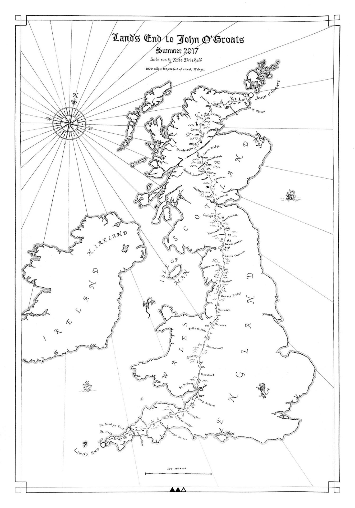 LAND'S END TO JOHN O'GROATSA hand drawn map covering this epic journey on a massive sheet of 70x100cm hand made Khadi paper, was one of my biggest and most enjoyable mapping challenges. Such a great story to tell."In 2017 I ran from Lands End to John O’Groats with a pack on my back and following trails as much as possible. It was a life changing experience and as I told stories in the first few weeks after I finished, I started to feel sad that it would all be forgotten and the memories would likely fade almost completely away. I wanted to find a way to be reminded of the journey and the little side-stories I experienced and heard from others I met on that journey.I knew of Owen’s art from the Centurion race memento t-shirts and once I saw that he took commissions I instantly knew he was the person who could help me to remember this run for many years to come.Owen was meticulous about the details as I jotted down notes and sent some photos to inspire the images, and he spotted and corrected where I’d already jumbled up memories with dates. As the process of creating the map progressed, it was quite an emotional experience to see it unfold as Owen created it and shared photos and video clips of the process.Every little detail on the finished art-work is just exquisite; from the tiny little motorbike at Dom’s Bike Stop in the West Country, through glorious peacocks and hairy cows up to the sweetest little cat I met in a B&B and the microscopic midges in Scotland. The detail is just incredible on all of the highlights and features. The cherry on the top came with the addition of the mythical beasts for each country of the UK I’d passed through - the scaly little dragon and very regal lion and unicorn really help to remind me of the enormity of what I did."- Kate Driskell