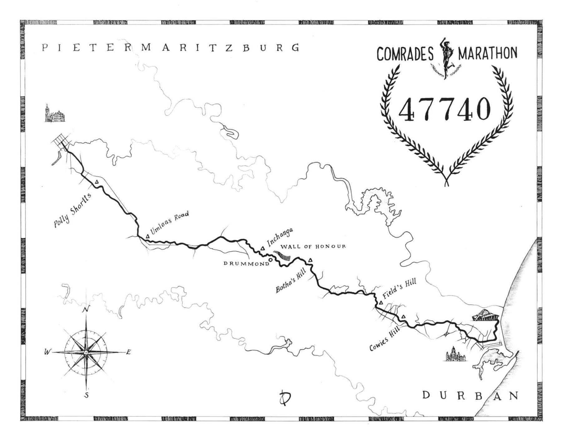COMRADESThe Comrades Marathon is an ultramarathon of approximately 89 km which is run annually in the KwaZulu-Natal Province of South Africa between the cities of Durban and Pietermaritzburg. It is the world's largest and oldest ultramarathon race.In 2018 I was commissioned to create a map for a 10 time finisher, and new green number holder of the Comrades Marathon, one of the world's most iconic running events.
